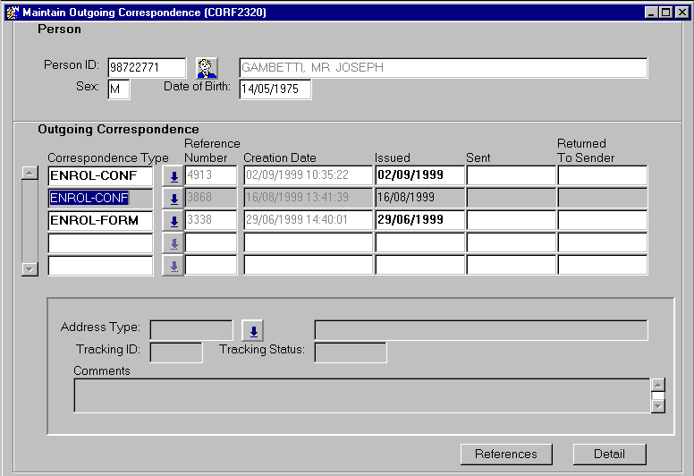 This form is used to view and record the items of correspondence, which have been sent to individual students. It is also used to record a second and any subsequent issue of the same correspondence item, both System and manually generated, to a student. The correspondence items must already be recorded in the System. They are recorded using the Register Correspondence Item form ( CORF2310). Further details of manually issued correspondence items may be recorded or viewed in the Correspondence Detail form (CORF2330) accessed via the Detail navigation button in this form. Where a number of students are sent the same correspondence item, use the Outgoing Correspondence Detail form (CORF2311) to record/view this. Reference details for a particular item can be viewed in CORF2321, accessed via the References navigation button.This block is used to display the student for whom outgoing correspondence is listed in the block below. |