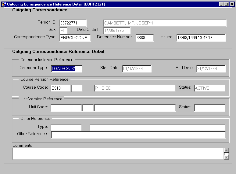 Outgoing Correspondence block: This block displays details of the outgoing correspondence item and of the person to whom the item was sent. To display a different outgoing correspondence item, return to the context form and select a different person and/or outgoing correspondence item. Outgoing Correspondence Reference Detail Block:This block displays the reference data for the context outgoing correspondence item. This may include Calendar Instance Reference; Course Version Reference; Unit Version Reference, Other Reference or Comments. Some reference fields may be empty. The data displayed in reference fields is determined by the reference data that was recorded when the correspondence item was registered. |