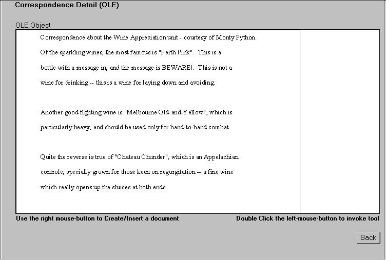 OLE can be used to store most types of correspondence including word processor, spreadsheet, graphic, sound and video correspondence. Correspondence can be created here but is more commonly created outside the System and copied into a file to be saved as an object in the System. |