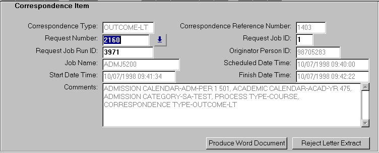 When entering this form, the user is in query mode. The user is able to query on correspondence type, request number, job name, etc. It is recommended that the request number or job name be used as this will ensure that the appropriate letter production or rejection should occur. Select the Produce Word Document button to invoke Word and produce the letters requested. Alternatively, select the Reject Letter Extract button, to delete the extract and all instances of the correspondence.