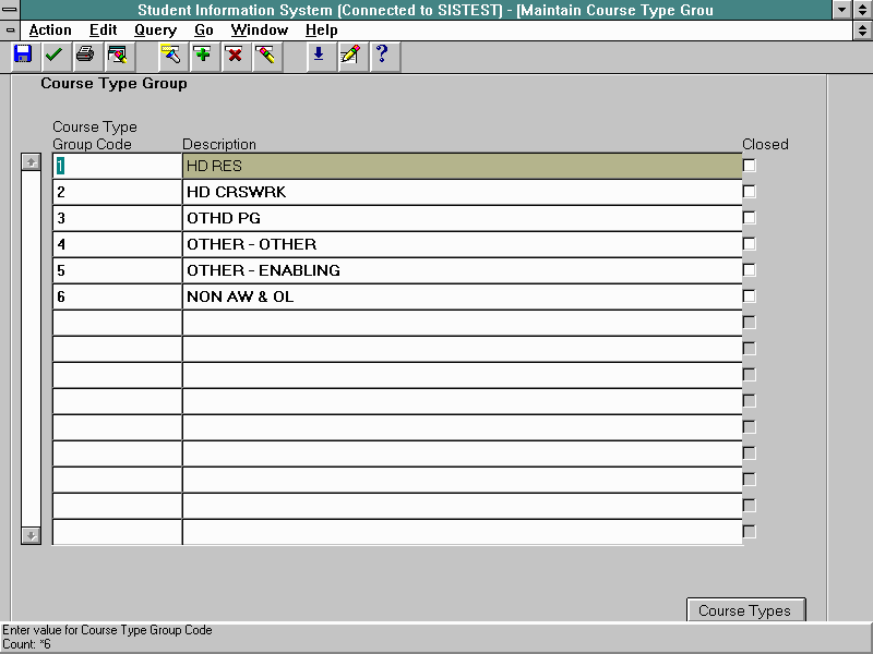 This form is used to record and maintain institution defined course type groups. Course type groups are comparable to Government and institution defined course types (which are mapped to Government course types) but provide for groupings of these course types to meet the specific needs of the institution. Thus, a course type may be assigned to membership of a course type group enabling future inquiry, reporting and manipulation of courses by group. |