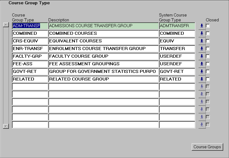 This form is used to maintain the set of institution defined course group types. Courses may be gathered into ad-hoc groups for specific purposes. Each course group is identified by a unique code. Course group types are used to classify course groups according to the purpose of the grouping. Each course group must be mapped to a course group type. Every course group type must be mapped to a system course group type that is recognised by the System for other functionality. |