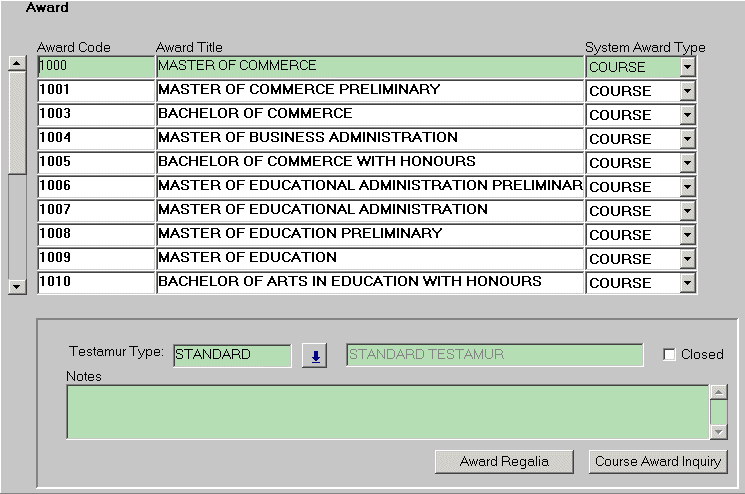 Course Award Inquiry block Maintain Award Regalia Form |