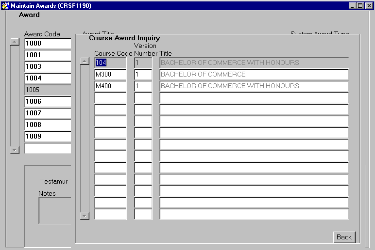This overlay screen displays all course versions associated with the selected award. The link between an award and a course version is maintained using (CRSF1250). |