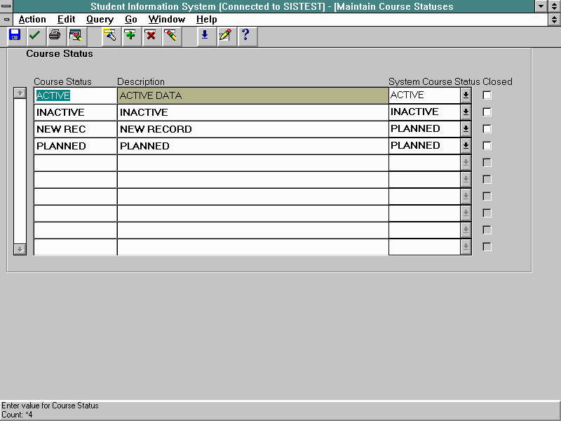 This form is used to record and maintain the set of institution defined course statuses . Course status classifies the state of activity of course versions, that is, whether course versions are active, inactive etc. Course Status is comparable to System Course Status but provides for greater flexibility by permitting classification at a more detailed level and the use of nomenclature familiar to the institution. |
