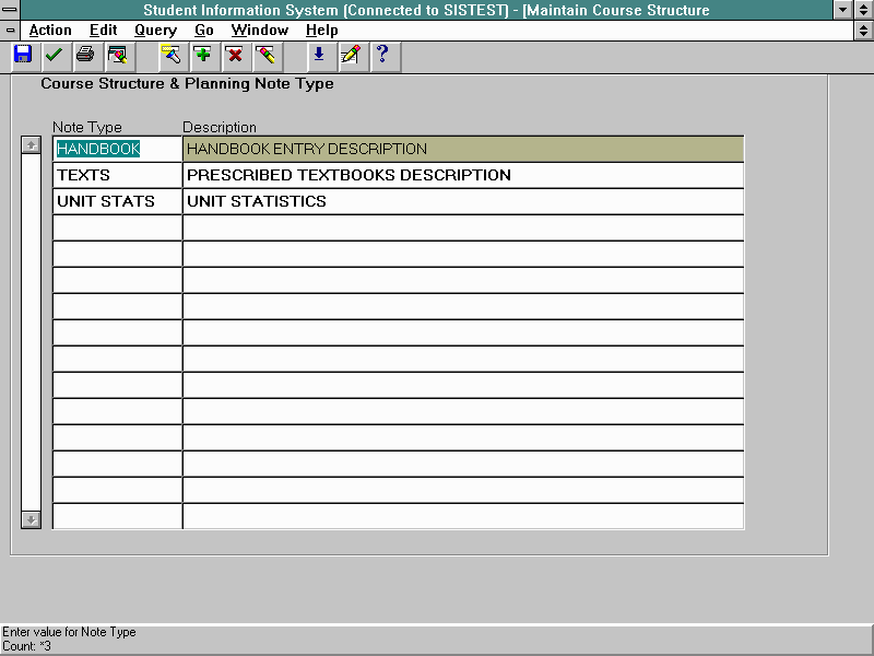 | Purpose | To allow the creation and maintenance of institution defined note types specific to the Course Structure and Planning Subsystem. | |