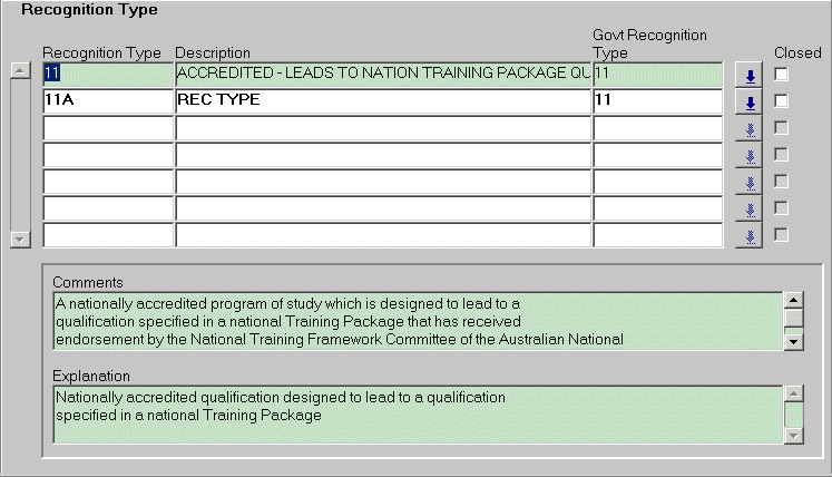 The purpose of this function is to maintain institution-defined recognition types. Each Recognition type is mapped to a Government Recognition Type. Recognition Types are used to distinguish courses by their level of recognition within the VET sector. |