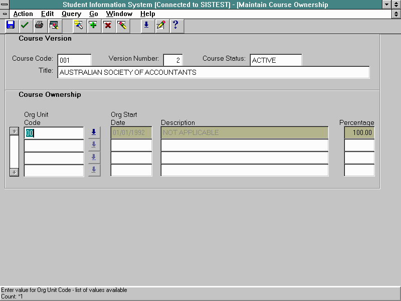 | If course version A300 - Bachelor of Arts, version x is selected in the Maintain Basic Course Details form, the Other Course Details navigation button is selected and the Course Ownership navigation button is selected from the displayed navigation buttons, then this form will display A300 - Bachelor of Arts, version x as the context record and any existing course ownership records relating to this course version will be displayed. |