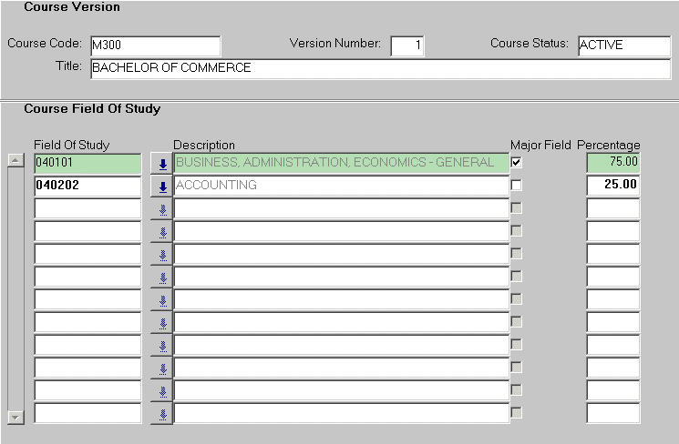 If course version A300 - Bachelor of Arts, version x is selected, then this form will display A300 - Bachelor of Arts and any existing fields of study relating to this course version will be displayed. |