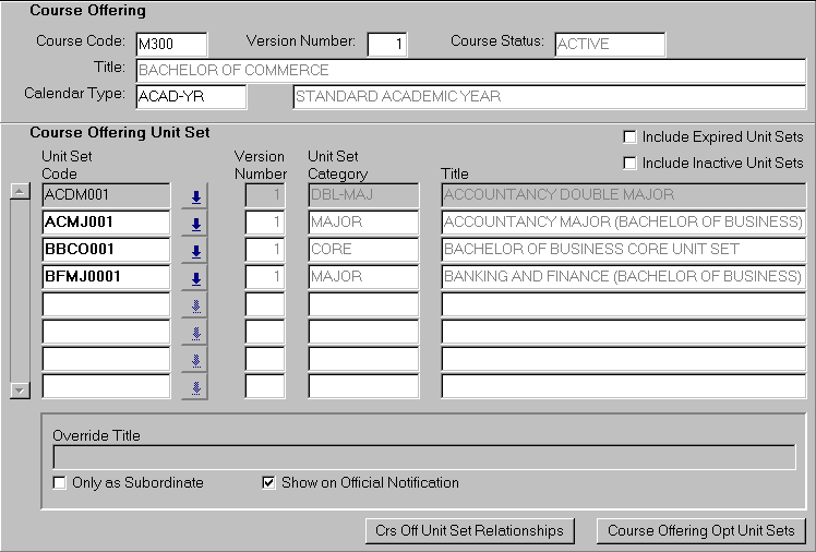 Maintain Course Offering Unit Set Relationship form Maintain Course Offering Option Unit Set form |