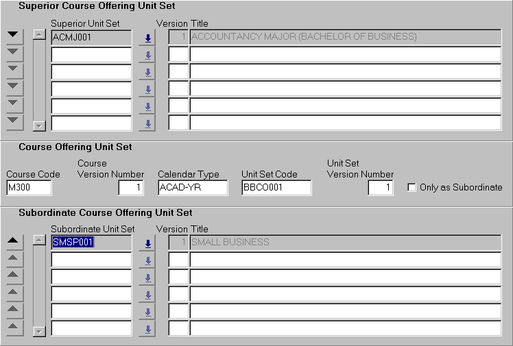 This form is used to create superior and subordinate unit set relationships for the course offering unit set displayed. Queries can also be performed on course offering unit sets. To create a superior or subordinate relationship, select a unit set from the LOV in the appropriate block. The LOV is restricted to those unit sets that have been applied to the course offering. The zoom buttons |