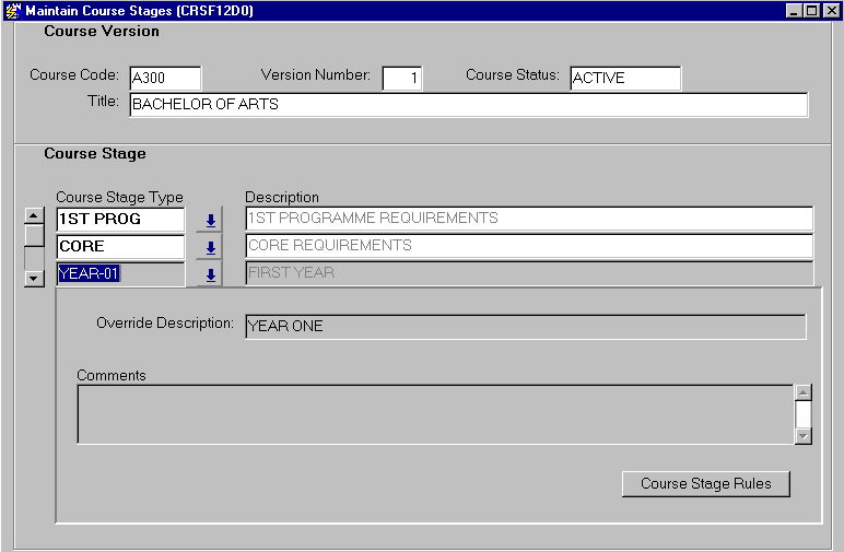 Stages of a course are institution defined milestones by which progression in a course can be measured. Typically, institutions view 'completion' of a year of a course as a measure of progression. For example, a three year degree would usually have three stages, year 1, year 2, and year 3. However, institutions or organisational units can use this facility to define course stages in any way they please. Institutions then apply rules to determine if a stage has been completed. This form is used to: