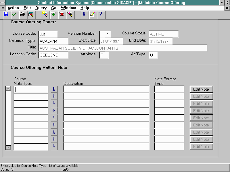 | Purpose | To allow the creation and maintenance of notes relating to course offering patterns | |