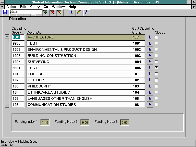 This form is used to record and maintain the set of institution defined discipline groups covering the courses offered by the institution. These are comparable to Government discipline groups (STAF1128) but provide for greater flexibility by permitting classification at a more detailed level and the use of discipline group names specific to the institution. Government discipline groups have unique codes to group units of study into like disciplines within branches of learning. Each institution defined discipline group must be mapped to a Government discipline group. More than one institution defined discipline group can be mapped to the same Government discipline group. |