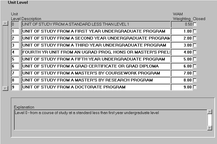 This form is used to record and maintain the available set of unit levels which may be used to define unit versions. Unit levels are used to specify the year level in which units are usually attempted, for particular course types. (ie. A unit version may have a different unit level depending on the course type it is associated with.) A unit level is generally (but not restricted to) the year level of the course(s) to which the unit belongs. Individual institutions will need to determine how unit levels will apply to units other than those in standard undergraduate, masters and PhD courses.Each unit level may be assigned a weighted average mark, weighting factor. This factor may act as a default value (overrideable) where weighted average marks are used elsewhere in the System. |