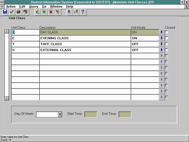 This form is used to maintain the institution defined set of available unit classes. A unit class describes the time and mode of availability of a class. Unit classes are assigned to unit offering options to describe the way the class will be presented to students. |
