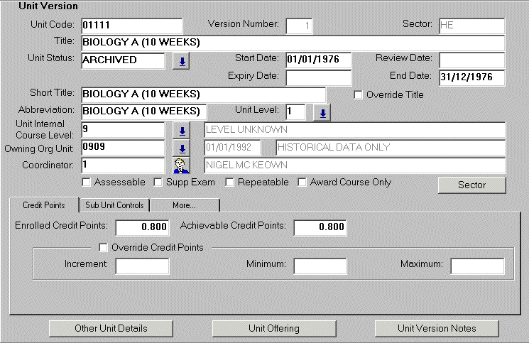 code in the Unit Code field and reset the Status field to 'PLANNED'.