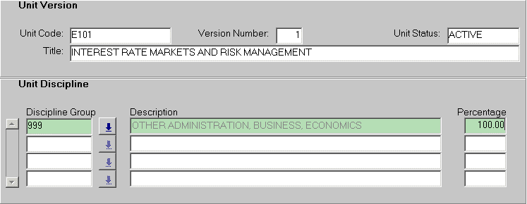 | The Unit Version block (context block) displays the current unit version record (context record) from the Maintain Basic Unit Details form. The displayed records in the Unit Discipline block are the unit disciplines which have been assigned to the context record. |