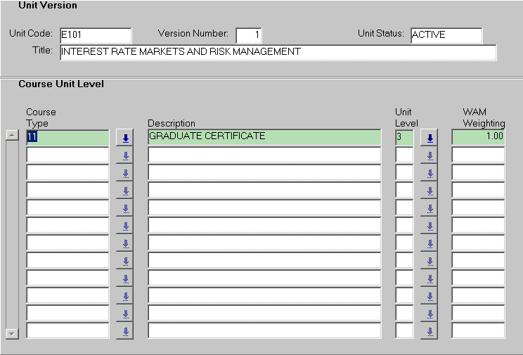 | When a unit is displayed in the Maintain Basic Unit Details form, with the Other Unit Details button and Course Unit Level navigation button selected, the form will display that unit as the context record, and any existing course unit levels relating to this record will be displayed. |