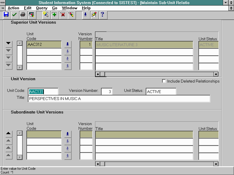 | The Unit Version block (context block) displays the unit version for which superior unit versions and subordinate unit versions are displayed, added or deleted. On entering the Maintain Sub-Unit Relationships form, the Unit Version block will display the context record which was the most recently selected unit version in the Maintain Basic Unit Details form. Superior and subordinate unit versions will be displayed for this context unit version.