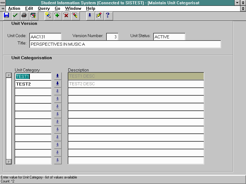 An institution may have a requirement that all students must complete a unit providing basic computer literacy. A category CL (or any other code) could be created, using the Maintain Unit Categories form which could be assigned to the displayed unit to indicate that it is part of the set of units resulting in basic computer literacy. Units in this category could then be used for progression purposes. |