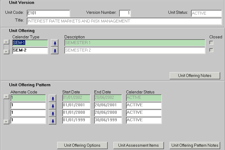 If the unit offering in the example above is to be offered in 1996 and 1997, the corresponding calendar instances can be selected in this block. ie. Calendar instances SEMESTER1 - 1/1/96 to 30/6/96 and SEMESTER 1 - 1/1/97 to 30/6/97. These two records would define the offering pattern of the unit version |