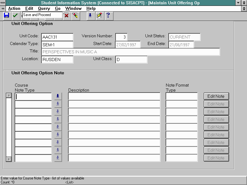 | When a unit offering option is displayed in the Maintain Unit Offering Options form and the Unit Offering Option Notes navigation button selected, then this form will display that same offering option as the context record and any existing notes relating to this record will be displayed. |