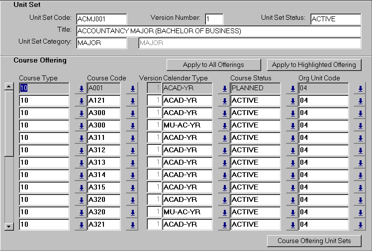This form allows for a unit set to be attached to an individual course offering or to multiple course offerings. The form is entered via the Apply to Course Offering navigation button in the Maintain Unit Sets form (CRSF4200). Upon entering the form from CRSF4200, the unit set details are displayed in context. The course type details displayed reflect the position of the cursor in CRSF4200. When the cursor is located in the Unit Set block of CRSF4200, upon entering this form, all courses for the course type restrictions applied are displayed. Where the cursor is located on a course type restriction, then only the courses for the highlighted course type restriction are displayed in this form. Queries can be performed in the Course Offering block to refine the course offerings displayed. The two function buttons are used to link the unit set to the course offerings.