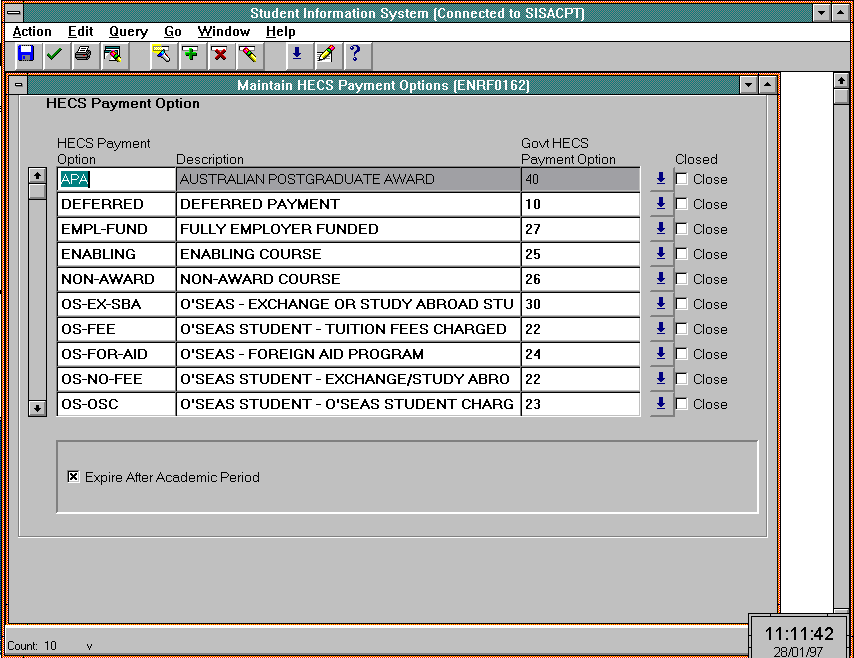 This form is used to record and maintain the institution defined set of HECS payment options. These are comparable to government HECS payment options (DEST element 380) specified in the Data Dictionary of the DEST manual, but provide for greater flexibility with the ability to subdivide government codes and to use more meaningful codes. Institution defined HECS payment options may be mapped to a government HECS payment option. Students in government reportable courses normally select a course attempt HECS payment option from the institution defined set, at enrolment. In some cases, such as reportable non-award courses, the appropriate HECS code is reported on the student's behalf, without the need for students to indicate the appropriate payment option. |
