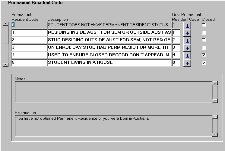 This form is used to record and maintain the institution defined set of residency codes. These are comparable to Government Permanent Resident Codes (DEST element 390) specified in the Data Dictionary of the DEST manual, but provide for greater flexibility with the ability to subdivide government codes and to use more meaningful codes. Each institution defined residency code must be mapped to a Government Permanent Resident Code. Permanent resident codes identify whether or not a person is a permanent resident of Australia and are used for DEST reporting and validation of HECS payment options. |