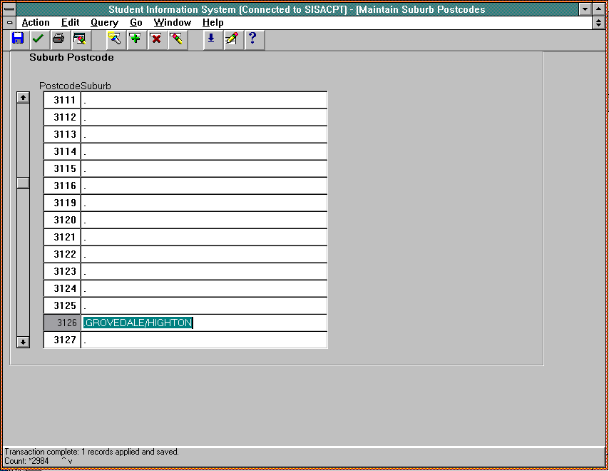 | This form is used to record and maintain the list of available Australian postcodes as advised by Australia Post. An individual postcode may represent several suburbs. In the System, postcodes are used for addresses and for person statistics. This form is not used for overseas postcodes, zip codes etc. These are not maintained within the System but are entered as required against overseas addresses. |