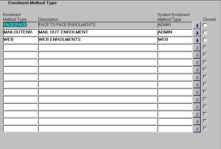 The procedure for enrolment of students is different where enrolment is in person to where enrolment is carried out using an interactive voice response system. By setting up two enrolment method types, FACE2FACE and IVRS, the enrolment procedure for each of these methods can be specified for each enrolment category. |
