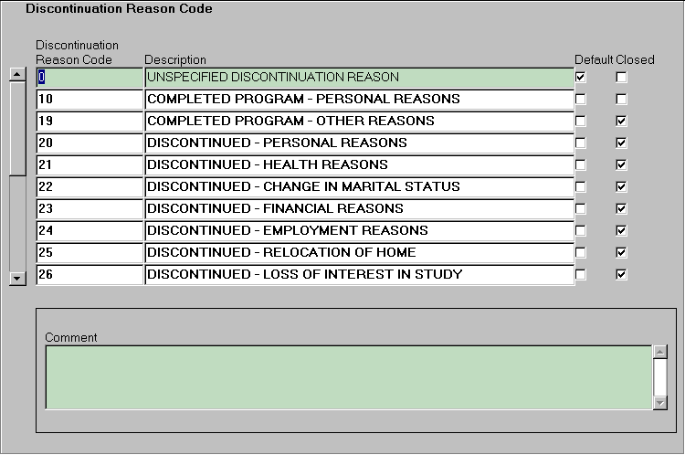 This form allows the entry and maintenance of coded reasons for discontinuation. These codes and reasons are determined by the institution, and appear in the enrolment form ENRF3000 to indicate either: