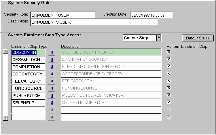 Select the Default Steps button. The complete set of available enrolment steps in all groups will be assigned to the security role, with permission granted. Steps not permitted to the role can then be deselected. To deselect: Select a step group from the list of values.
