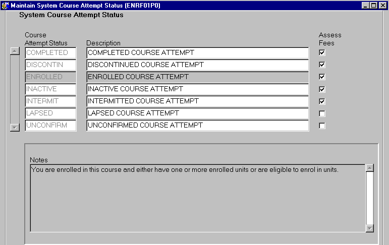 This form is entered displaying all system course attempt statuses. For each system course attempt status, record an explanation of the status in the Notes field. The course status description may also be updated if necessary. The Assess Fees indicator shows whether or not fees can be assessed for course attempts of that status. The UNCONFIRM status is an exception in that predictive fee assessment can be performed for unconfirmed student course attempts when this is done through FINJ3500. This indicator is System set and cannot be modified by users. |