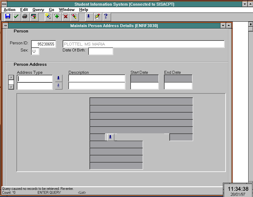 Accessing the Maintain Person Address Details form directly from the menu allows the user to query details in the Person Detail block and retrieve a number of records one after the other. If the form is accessed from another form (for instance from ENRF3000 as a step in the enrolment process) it opens with a student ID carried forward as the context record. In these circumstances it is not possible to query any other person details. Note that the person query function in this form is not as powerful as that in the Find Person form (ADMF1211). Names are case sensitive and are best avoided as query criteria. To avoid delays in retrieving records it is preferable to use Person ID numbers as query criteria. |