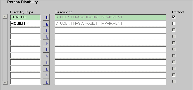 This block is used to record disabilities for the person whose record is displayed. Refer to DEST element 386 for further details. Disability types are institution defined values which are maintained using the Maintain Disability Type form (ENRF01A0). |