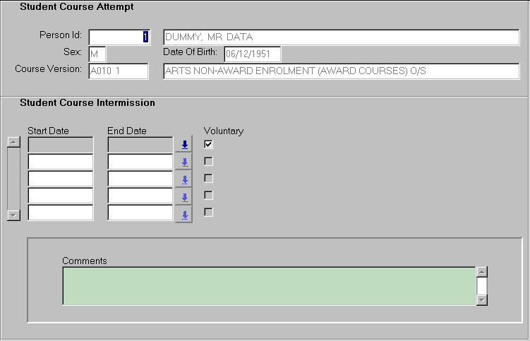 This block is used to record and maintain details of intermissions granted to a student for a particular course attempt. It allows for entry of a start date and entry (or selection from a list of values) of an end date for an intermission period. The end of an intermission is most likely to coincide with the start of an appropriate teaching period. The list of values for the intermission end date therefore allows selection from teaching period start dates. A checkbox is used to record whether the intermission is at the student's request. Any additional information can be recorded in the Comments area. Certain