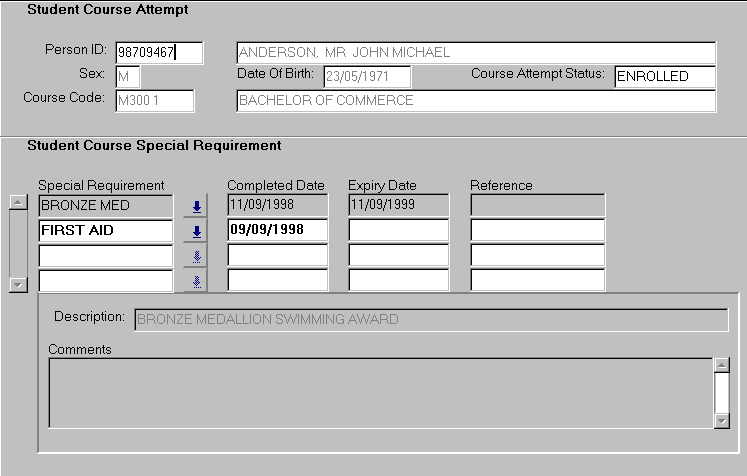 This form is used to record details of special requirements undertaken by the student towards the completion of their course attempt. Special requirements are typically external courses a student may be required to undertake in order to complete their course attempt. For example: students studying physical education may require the completion of a level 2 St John Ambulance or Red Cross first aid certificate as part of their course. Students would undertake this study outside of their regular study hours. With the introduction of progression rules (Callista release 1.4), a student's course attempt can be checked to ensure special requirements are completed before approving course completion. The form is typically entered via the Special Requirements button in the Course Attempt screen in the Record Enrolments form (ENRF3000). The form may also be entered via a menu or zoom. When entering the form through ENRF3000, the student course attempt details are displayed in context. Queries cannot be performed on student course attempts in this entry method. Queries can be performed on student course attempt where the form has been entered via a menu. |