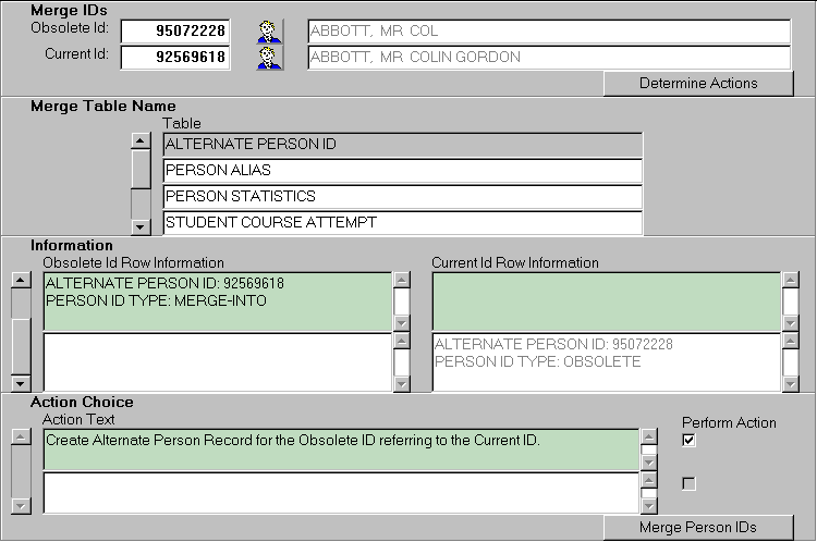 This block is used to record the two ID numbers to be merged. The Determine Actions button is then selected to display details of the data to be merged. Users of this function should have an understanding of the data being merged. |