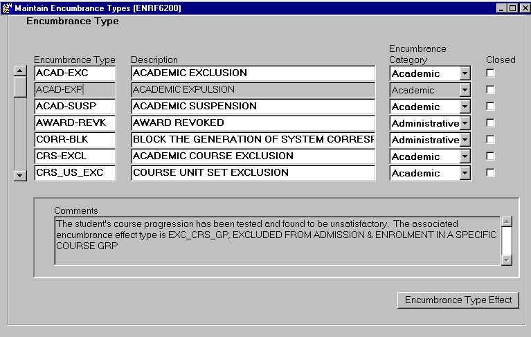- The effects attached to an encumbrance type are applied to a student when the encumbrance type is recorded against the student. This is covered in detail under ENRF6320.