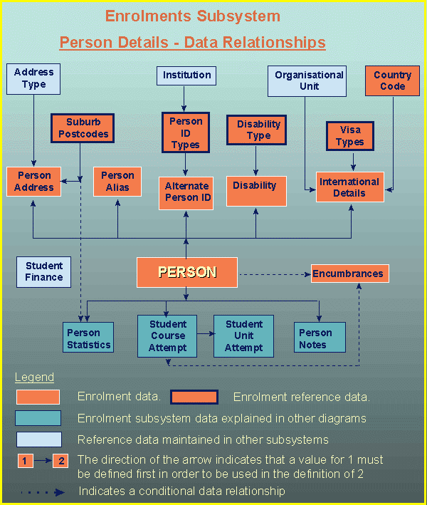 The Person Details diagram above shows the main data relationships relating to a person record. The Enrolments subsystem is concerned with a particular group of person records-those of students. Each student is identified by a standard set of data including an identification number, surname and given names and birth date. The System also allows you to record additional personal data for a student such as alternative names, disability details and visa details for international students. In order to record some of this personal data, reference data must first exist. The reference data is then used in the definition of the personal information.