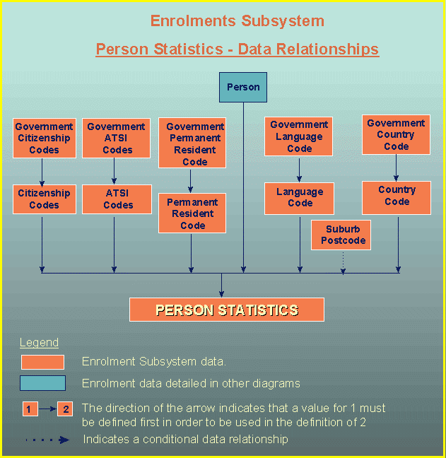 The Person Statistics diagram shows that the majority of statistical data recorded against a student is in the form of predefined codes. Most of these codes, in turn, map to government specified codes which are used to report student statistical information to government. These codes are reference data and must be set up prior to the recording of student statistics.