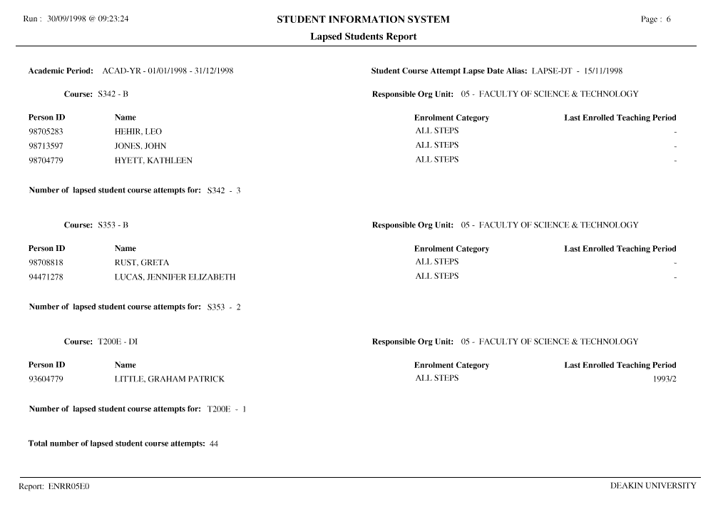 A report of all student course attempts lapsed in this process is produced. At this time, no correspondence is generated informing the student that their course attempt has been lapsed. |