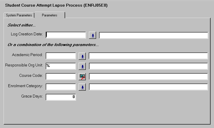 Most parameters in this job are used to restrict the set of records to which the process is applied. The Grace Days parameter is set to prevent INACTIVE student course attempts from being lapsed within the specified number of days past the Enrolment Form Due Date and Override Form Due Date. Selecting the Log Creation Date parameter allows for the re-running of a previous report. When selected, all other parameters are ignored. |