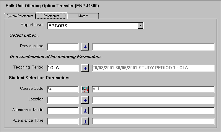 Student Selection Parameters These parameters are used to target specific groups of students to be transferred between unit offering options. They can be combined as required. |