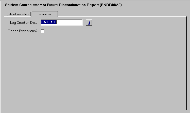 This is a report of discontinuations processed through the batch job ENRJ5100 (Update Student Course Attempt Status). If a future date has been entered for the discontinuation, the batch process attempts to effect the discontinuation when the date is reached. It may include all records or only exceptions (i.e. discontinuations which could not be effected). |
