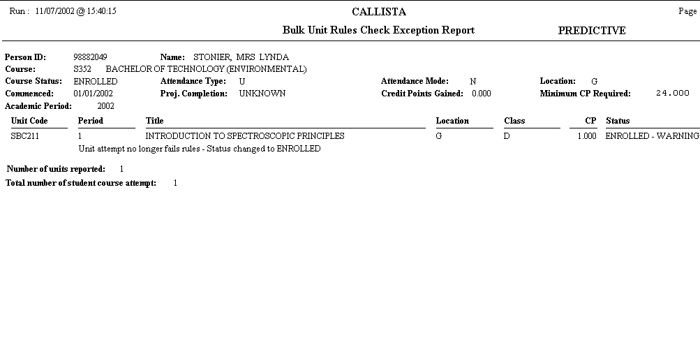 This report produces an exception report from the log file produced in the Bulk Unit Rule Check process (ENRJ0010) |