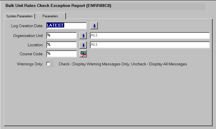 the Log Creation parameter. Run logs are created in ENRJ0010. Optionally restrict the report to a particular organisation unit, location or course code. The report can be set to display only warnings or all messages encountered. |