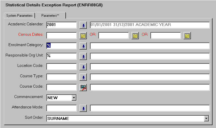 Most parameters for this job are used to refine the data set produced in the report. At least one Census Date MUST be recorded. Commencement Date can display: